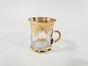 Suite de 4 tasses à thé en verre tulipe à fond plat et petite anse, le décor doré de style guirlande à draperie rubanée et couronne de lauriers de style Empire. Travail moderne étranger.H. 9 cm. Diam. au col : 7.8 cm. TBE.