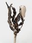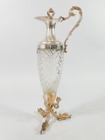 - Verre à pied d’artiste à monture moderniste en métal argenté à décor de longues feuilles tournoyantes perlées de gouttes d’eau et d’une plaque de nacre posées sur et sous une longue hampe à tige tubulaire, le pied circulaire en cristal, la paraison cassée manquante dans la corolle en tulipe tournoyante. H. du verre : 24.1 cm. Colle visible à la jonction du calice. - Aiguière à décanter ovoïde en cristal à pointes de diamants, les montures en métal argenté à piétement tripode aux trois dauphins, l’anse volute au dauphin et le bec verseur en pointe lancéolée à bouchon en trèfle ajouré. Rayures et oxydations. Bouchon accidenté se décollant de sa base. H. de l’aiguière : 37 cm. Diam. à la base : 15 cm environ.