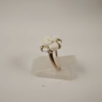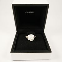 CHANEL n°6P5643 – Bague « Camélia » en or jaune 750 millièmes et céramique blanche, épaulé d’un motif serti de brillants. Pds brut : 3 ,8 grs.