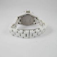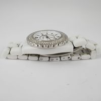 CHANEL Swiss made n°D.S.09904 – Montre “J12” en céramique blanche, cadran 34mm, chiffres arabes, lunette tournante sertie de brillants, dateur à quatre heure, mouvement quartz, bracelet articulé sur boucle déployante.