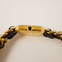CHANEL Swiss made n°X.H.12758 – Montre “Première” plaqué or, cadran noir 20mm, mouvement quartz, bracelet double rangs de chaîne entrelacées de cuir agneau noir. T.L.