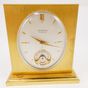 HERMES Paris Swiss made. Pendulette de bureau de forme rectangulaire en métal doré brossé, cadran blanc, index bâtonnet, mouvement mécanique, mouvement apparent, alarme. Coffret d'origine. Dim. : 7,5 x 8 cm. (Manque clé)