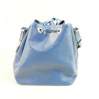 Louis VUITTON année 1994 – Sac « Petit Noé » 25cm en cuir épi bleu Tolède, fermeture par un lien coulissant, anse bandoulière sangle réglable. Bon état (légères usures, traces).