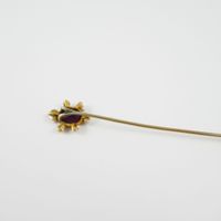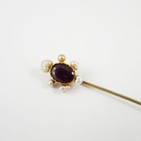 2 épingles dont 1 en or 375 mil (pierre imitation, système métal), et 1 en métal doré (rhodolite, perles de culture baroques, système métal) (égrisures). 8,5 g brut.