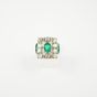 Bague en platine 850 mil à chaton rectangulaire incurvé serti d’une émeraude ovale dans un entourage de diamants TA, épaulé d’émeraudes calibrées (TDD : 51,5) (émeraudes cassées, monture coupée, égrisures). 7,4 g brut.