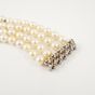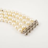 Bracelet de 4 rangs de perles de culture (diamètre : 6,5 à 6,8 mm environ), avec fermoir et éléments intercalaires en gris 750 mil, le fermoir serti de diamants brillantés et 8/8 (longueur : 19,5 cm environ, largeur : 2,8 cm environ). 51,8 g brut.
