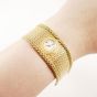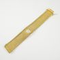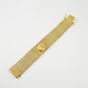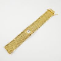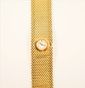 Bracelet-montre de dame UNIVERSAL Genève en or 750 mil, petit boîtier rond, cadran champagne à index doré, mouvement mécanique (non signé), sur bracelet ruban en or 750 mil tressé, avec double huit de sûreté (longueur : 16,5 cm, largeur : 2,5 cm, diamètre cadran : 1 cm) (bracelet accidenté au niveau du remontoir, manque 1 index). 88,1 g brut.
