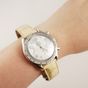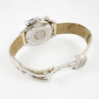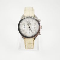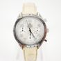 Montre-bracelet OMEGA Speedmaster chronographe en acier, boîtier rond, lunette graduée, cadran en nacre à chiffres arabes luminescents, 3 compteurs, mouvement automatique, sur bracelet en cuir blanc usé avec boucle déployante signée (diamètre du boîtier : 38 mm) (salissures).