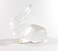 LALIQUE France, "Lièvre" Epreuve de tirage industriel en cristal moulé-pressé blanc transparent et satiné mat, signature à la pointe sous la base. Hauteur : 13 cm ; largeur : 13,5 cm ; 6 cm.