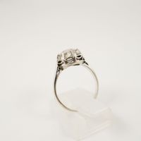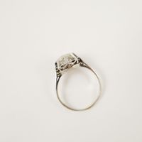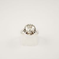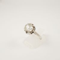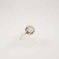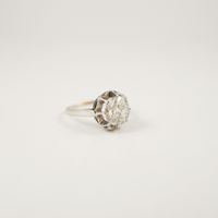 Solitaire en platine 950 mil orné d’un diamant taille ancienne de 1.20 carat environ en serti griffes. Travail français. (TDD : 54). (Trace de mise à taille, fêles, manques de matière en surface). 3,6 g. brut