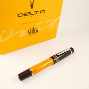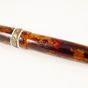 (Exemptée art. 524 bis du CGI, al c.) Stylo-plume STIPULA collection « Etruria » en résine marbrée rouge-brun, agrafe et bague en argent 925 mil., plume en or 750 mil. Remplissage piston. Signé. (Avec écrin).
