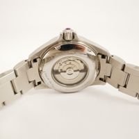 Bracelet-montre de dame MAUBOUSSIN « L’heure de Paix » en acier, boîtier rond, cadran noir et argenté, chiffres romains appliqués, guichet dateur à 3H, saphir rose au remontoir et trotteuse rose, mouvement automatique apparent, bracelet et boucle déployante papillon en acier, signé et numéroté, accompagné de sa boîte, de son écrin et de quatre maillons supplémentaires, bel état (diamètre : 33 mm environ) (longueur : 17 cm environ).