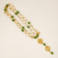 Collier en or 750 mil. martelé à maillons ronds alternés de boules de néphrite, retenant deux médailles ajourées de symboles protecteurs (longueur : 53 cm environ). 17 g. brut