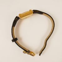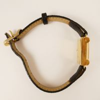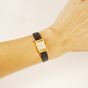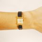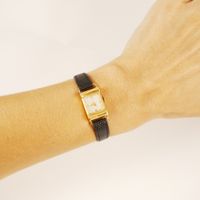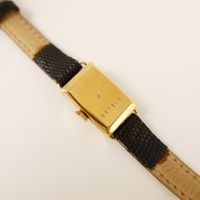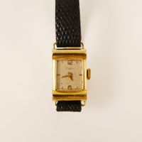 Montre-bracelet de dame en or 750 mil., petit boîtier rectangulaire, cadran crème, index point et chiffres arabes appliqués, mouvement mécanique signé Certina, bracelet en cuir usé, boucle ardillon en métal, travail français des années 1940 (dimensions : 21 x 14 mm) (soudure, usures). 13,4 g. brut