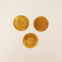 Trois pièces de 10 FRF en or 900 mil. (usures). 9,7 g.