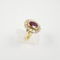 Bague « Pompadour » en or 750 mil. centrée d’un rubis taille ovale de 1,30 carats environ en serti clos dans un entourage de diamants brillantés. (TDD : 54). 5,6 g. brut