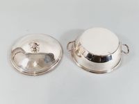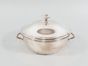 AUBRY-CADORET, Production contemporaine : Cassolette en métal argenté uni de forme ronde à moulures de filets et 2 petites anses baguées, le couvercle à prise bouton. Nouveau poinçon de Maître post 1983. Dim. 13.7 x 19.2 cm. L. aux anses : 23 cm. Etat quasi-neuf.