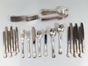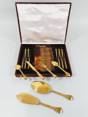 BIENVENU-PLATIL, XXe siècle : ménagère rocaille de 41 pièces en métal argenté comprenant 6 grandes fourchettes, 7 grandes cuillers, 7 grands et 7 petits couteaux, 1 couvert à salade et 12 couteaux à poisson. Modèle filet violoné à petite coquille déchiquetée et rinceaux feuillagés fleuris. Ancien poinçon carré. Les lames inox signées Platil. Légères rayures. Non chiffrée.