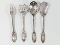 CHRISTOFLE : 6 cuillers à moka PERLES en métal argenté. Signées. Période 1935-1983. Non chiffrées. Prix neuf actuel en ligne : 55 euros la pièce. L. 10 cm. + Lot de petites pièces de service en métal argenté, non chiffrées, XXe siècle : - 8 cuillers à thé ou café tiges à la russe, vers 1910.- 9 fourchettes à gâteaux de la S.F.A.M des années 1930. Rayures d’usage. + 4 pièces à hors d’œuvre vers 1900 de style Louis XVI en fer blanc comprenant 1 fourchette à saucisson, 1 fourchette à viande froide, 1 pelle à pâté (oxydation) et 1 cuiller à olives . L. 16 à 17 cm.
