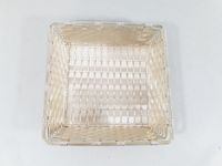 CHRISTOFLE, fin du XXe siècle : corbeille à pain vannerie en métal argenté tressé de forme carrée. Signée Christofle France. Ancien poinçon de fabricant du cavalier OC 1935-1983. Production moderne. Côté : 23.5 cm. H. 5 cm. TBE. Quasi neuf. + housse Christofle T.22