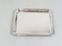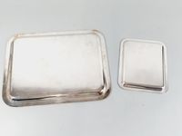 CHRISTOFLE, RUBANS, XXe siècle, ante 1983 : Plateau de service (35.7 x 28.3 cm) et petit plateau addition ou vide-poche (20.5 x 16.5 cm) en métal argenté à filets rubanés. Signé Christofle France. Ancien poinçon de fabricant du cavalier 1935-1983. Production moderne. Légères rayures. + 2 housses Christofle (T.20 et T.9).