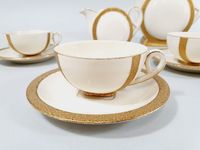 EPIAG, EPOQUE ART DECO, TCHECOSLOVAQUIE : Service à thé en porcelaine crème et or de 13 pièces comprenant 5 tasses (dim. 4.4 x 8.5 cm) et leurs soucoupes (diam. 13.3 cm), 1 théière (H. 16.7 cm), 1 sucrier couvert (H. 11.9 cm) et 1 pot à lait (H. 9.4 cm) de forme circulaire ou ronde sur une base rectangulaire ou carrée. Les décors or grenelés à demi-cercles ou cercles. Cachet et numéro de modèle 12766. Micro-rayures. TBE. Long fêle sur une tasse visible.