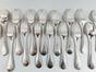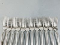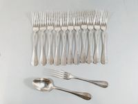 ERCUIS, XXe siècle, premier tiers : suite de 12 grands fourchettes et 12 grandes cuillers en métal argenté, modèle baguette. Signée. Ancien poinçon de Maître au centaure.+ un lot en métal argenté de la maison BOULENGER de la même période : 1 pince à sucre rocaille asymétrique à pieds griffe et 1 timbale tulipe unie à frise cannelée (piqûres internes). Rayures d’usage.
