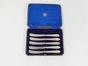 GEORGES HAPE, circa 1913 : suite de 5 tartineurs, les manches navette en argent fourré 925 mil. à filets rubanés de feuillages, les lames rondes en acier inoxydable. Poinçons de Sheffield lettre v. Poinçons modernes de Londres (lettre b 2001). Dans leur écrin (pour 6) de la maison CARRINGTON & Co à Londres Regents Street. Poids brut total : 126.7 g. L. 17.2 cm. Légères rayures. TBE général. Non chiffrés.