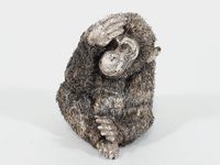GIANMARIA BUCCELLATI, XXe siècle, vers 1970-1990 : Singe au naturel ne voyant pas le mal en argent et vermeil, le corps en fils d’argent, le visage, les pieds et les mains gravés. Poinçons italiens de titre 800, poinçon de responsabilité. Signé Gianmaria BUCCELLATI Italy. Exempté art. 524 bis al. c. Poids : 122.4 g. H. 9.5 cm. Restauration sur un pied et la main à la base avec traces de colle. La signature et les poinçons sont partiellement lisibles en raison de la colle.Fait partie d’une série des singes de la sagesse de la maison BUCCELLATI. Les trois singes étant celui qui ne voit pas le mal, celui qui n’entend pas le mal et celui qui ne parle pas le mal. En anglais « see no evil, speak no evil, hear no evil ». Il s’agit ici du singe ici qui ne voit pas le mal