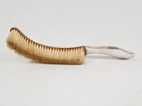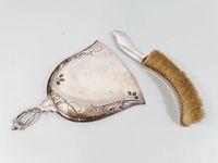 QUIST, Allemagne, fin XIXe siècle : Pelle à poignée végétale ajourée et sa brosse-ramasse-miettes d’époque ART NOUVEAU en métal argenté à décor naturaliste de feuilles et ovules de Ginkgo. Poinçon de Maître sur la pelle. Petites usures et piqûres. L. des pelles : 26.7 cm. et 27.6 cm. Largeur de la grande : 20 cm. Ce modèle Ginkgo est original dans son mouvement typiquement Art Nouveau. La maison Quist à Esslingen fût particulièrement importante au début du XXe siècle et une grande concurrente de la maison WMF. Elle ferme en 1981