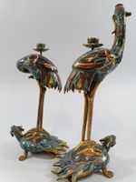 Paire de bougeoirs en cuivre cloisonné représentant deux échassiers, debouts sur des tortues fantastiques, et tenant dans leurs becs le binet en tulipe. CHINE, fin du XIXème -début du XXème siècle. Hauteur : 26 cm et 32,5 cm. (Chocs, éclats à l'émail)