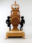 Pendule de forme lyre en métal doré et noirci, et marbre blanc, surmontée d'une cassolette et encadrée de deux jeunes satyres, elle repose sur une base à décor de trophées, pieds en griffe, cadran émaillé blanc à chiffres romains signé. (Avec une clef). Dimensions : 60 x 33 x 19 cm. (Manque la guirlande fleurie tenue par les satyres)