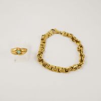 Bracelet en or 750 mil. (longueur : 200 mm environ) (chocs et déformations).Bague en or 750 mil (émeraude ronde) (TDD : 55) (déformations, égrisures).16,9 g. brut.