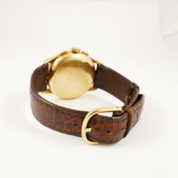 Montre-bracelet Tri-Compax chronographe, en or 750 mil., boîtier non d'origine postérieur rond, cadran crème à quatre compteurs dont une phase de lune à 12H indiquant les jours, index épi appliqués dorés, guichets dateurs jour/mois (en italien), mouvement mécanique, bracelet en cuir brun usé, boucle ardillon en métal. Seuls le cadran et le mouvement sont signés "Universal". (diamètre : 33 mm environ) (usures et légère déformation des aiguilles). 44,7 g. brut