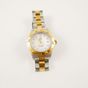 Bracelet-montre de dame TAG HEUER Aquaracer en acier et métal doré, boîtier rond, lunette tournante graduée dorée, cadran en nacre à chiffre arabe et index diamantés, guichet dateur à 3 H, mouvement à quartz, sur bracelet en acier et métal doré à boucle déployante signée (diamètre du boîtier : 28 mm, longueur du bracelet : 15 cm environ) (boucle déployante défectueuse).