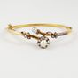 Bracelet rigide ouvrant en or 750 mil rehaussé de motifs floraux, dont un centré d'une perle de culture entourée de roses couronnées et orné à son autre extrémité d'un diamant TA (envion 0,35 ct). (Diam : 5,7 x 4,8 mm environ). 12,2 g brut.
