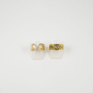 160 / 240 €Bague bandeau ouverte 3 ors 750 mil à motifs de C affrontés sertis de diamants taille 8/8. (TDD : 55 ; Largeur : 0,8cm environ). (Une pierre cassée). 3,7 g. brut Bague en or 585 mil à corps ajouré, centrée d'un diamant taille 16/16 en serti clos. (TDD : 55). (Usures et manques). 4 g. brut Poids total brut : 7,7 g.