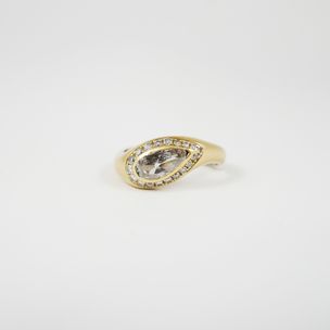300 / 500 €Bague mouvementée en or 750 mil centrée d'un diamant taille poire en serti clos, dans un entourage de diamants taille brillant et 8/8. (TDD - avec anneau de mise à grandeur : 61). (Pierre centrale accidentée). 8,2 g. brut