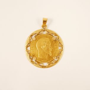 750 / 850 €Pendentif en or 750 mil retenant une pièce de 50 FRF en or 900 mil (1856 A). (Dimensions : 4,9x3,9cm environ). (Soudures). 22,9 g. brut