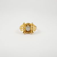 Bague en or 750 mil et platine 950 mil à godrons et enroulements centrés d’un diamant demi-taille de 0.10 carat environ. Travail français des années 1940-1950. (TDD : 56). (Manques de matière au rondiste). 3,9 g. brut