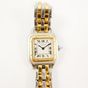 Bracelet-montre de dame CARTIER Modèle « Panthère » en acier et or 750 mil exempté, petit boîtier carré, lunette en or 750 mil à décor de vis, cadran crème à chiffres romains et chemin de fer pour les minutes émaillés noirs, fond vissé, mouvement à quartz, pierre de synthèse cabochon bleue au remontoir, sur bracelet à maillons Panthère articulés en acier et deux rangs d’or 750 mil exemptés, boucle papillon déployante signée. Signé et numéroté. Sans écrin ni papiers. (Dimensions boîtier : 22x22mm ; Tour de poignet : 16cm environ). (Légères égrisures et rayures). (Article 524 bis du CGI alinéa c). 43,6 g. brut