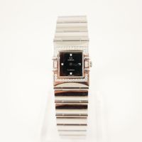 Bracelet-montre de dame OMEGA « Constellation » en acier, boîtier carré inscrit dans le bracelet, lunette sertie de diamants brillantés, cadran noir à index diamantés, mouvement quartz, sur bracelet en acier à boucle déployante siglée. Signée et numérotée. (Dimensions boîtier : 19,5 x 24,2 mm). (Tour de poignet : 16 cm).
