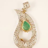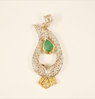Pendentif « Boteh » ajouré 2 ors 750 mil. centrée d’une émeraude taille poire de 3,50 carats environ et pavé de diamants brillantés bruns-jaunes. (Hauteur : 8 cm environ). (Emeraude : Fêle affleurant la surface, éclat) 44,5 g. brut
