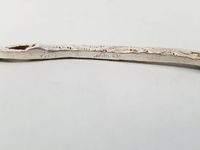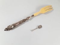 ALBERT BODEMER, ALLEMAGNE, Années 1950 : suite de 6 fourchette fourchettes à gâteaux en argent 835 mil. à la rose de Hildesheim. Signées. Titrage. Poids : 100.4 g. L. 14.5 cm. Exemptées art. 524 bis al. b du CGI sauf 1 contrôlée au Cygne. La ville d'Hildesheim est connue en Allemagne comme la ville de la rose avec la légende du rosier millénaire de l’abside de sa cathédrale qui a survécu au bombardement de la fin de 2e guerre mondiale en 1945.+ lot en argent : - 1 pelle à sel 950 mil. à la tête de sanglier des menus ouvrages par JULES GALLERAND (actif 1880-1895) (6.8 g). - 1 petite pique péruvienne à condiments 925 mil, exemptée art. 524 bis al. b du CGI. (4.5 g). - 1 fourchette à servir la salade manche Néo-Renaissance argent fourré 800 mil. et résine ALLEMAGNE fin XIXe siècle, exemptée art. 524 bis al. c du CGI (brut : 59.2 g).