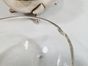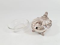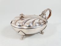F. BROGGI à milan, XXe siècle, années 1950 : service à parmesan vintage en métal argenté modèle ovale en coquille quadripode, son anse feuillagée tubulaire, le couvercle à charnière et prise toupie, sa doublure en cristal (légèrement ébréchée sur un bord). Signé. Légères rayures et petites piqûres d’oxydation dans le couvercle. TBE général. H. 9.8 cm et L. 18 cm.