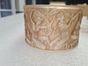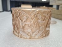 RENE LALIQUE (1860-1945) : boite à poudre "FIGURINES ET VOILES" en verre moulé-pressé satiné à décor patiné rosé de jeunes filles en fleur dansantes dans des guirlandes de roses rubanées. Epreuve de tirage industriel. Signée en relief R. LALIQUE et MADE IN FRANCE sous la base. Infimes égrisures. Petits fêles avec lignes de restaurations visibles sur un côté. BE général. Diam. 10.5 cm. H. 7 cm. Modèle créé en 1929, non repris après 1947, réalisé pour le parfumeur MARCAS et BARDEL. Bibliographie : Félix MARCILHAC, R. Lalique, Catalogue raisonné de l’oeuvre de verre, Les éditions de l’Amateur, Paris, 1994, modèle similaire reproduit p. 241, n° 97.