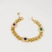 Bracelet en or 750 mil à maillons tank articulés, rehaussés de trois motifs entourés de diamants et centrés d'un cabochon de rubis, d'émeraude ou de saphir (Long : 18 cm) (Usures). 32,4 g brut.