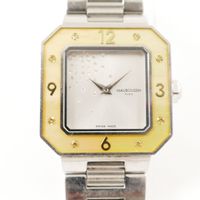 Bracelet-montre de dame en acier, boîtier carré (Dim : 28 mm) à lunette en nacre, à chiffres arabe et diamants, cadran muet parsemé de diamants 8/8, tour de bras à plaquettes acier articulées (Long : 17 cm environ), MAUBOUSSIN, "Amour, le jour se leve", mouvement quartz.