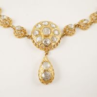 Collier en or 750 mil à maillons ronds, ajourés, rehaussés de roses retenant un motif central et une pampille ornée de roses (Long : 40 cm). 30,4 g brut.