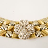 Tour de cou en ors de couleur 750 mil à décor de passementerie, centré de coeurs diamantés figurant un trèfle à quatre feuilles (Long : 46 cm; Larg : 1,8 cm). 94 g brut.